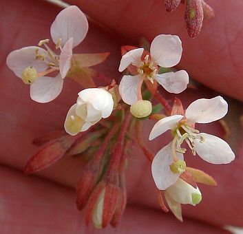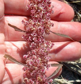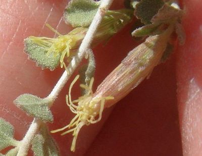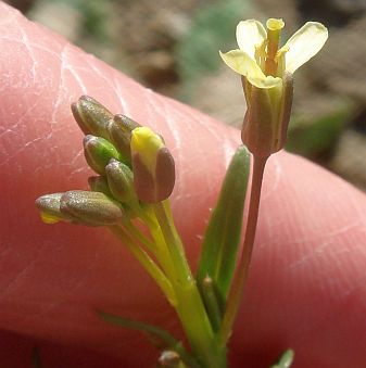 We continue to find that the annuals in bloom are very small. A dramatic example is shown by Mike Crouse's picture of hairy-podded pepper-grass, Lepidium lasiocarpum var. lasiocarpum, in bloom and fruit, with the tip of a ball-point pen (~8 mm = ~0.3 inches) alongside it for scale. The entire plant is less than a half inch tall, whereas in good years it is ten times taller.