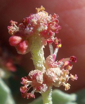 Cheesebush is nearly impossible to tell when it is in bloom by eye. What most people think of as the flowers for this species are actually the bracts on the fruit. But the bees know when it is in bloom, so all we had to do to find the plants in bloom was to watch for the bees!