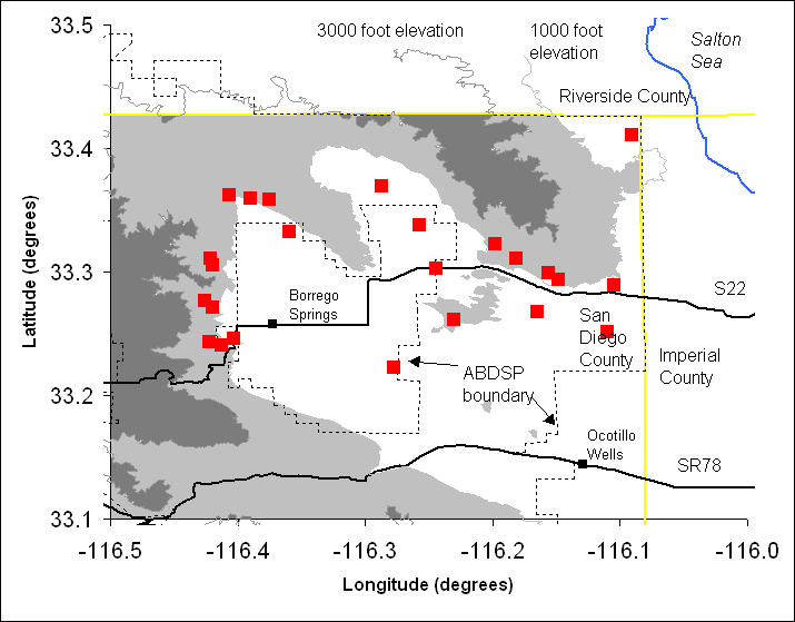 Note that there is often quite a difference in the annual bloom between the moister canyons west of Borrego Springs and the drier areas around the Badlands. Similarly, even within those canyons on the west, there can be large differences between the north-facing and south-facing slopes, and between canyons with permanent water, like Borrego Palm Canyon, and drier canyons. In the drier areas to the east, there can be large differences between the edges of washes and the middle of washes, and between shady canyons and open areas.