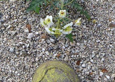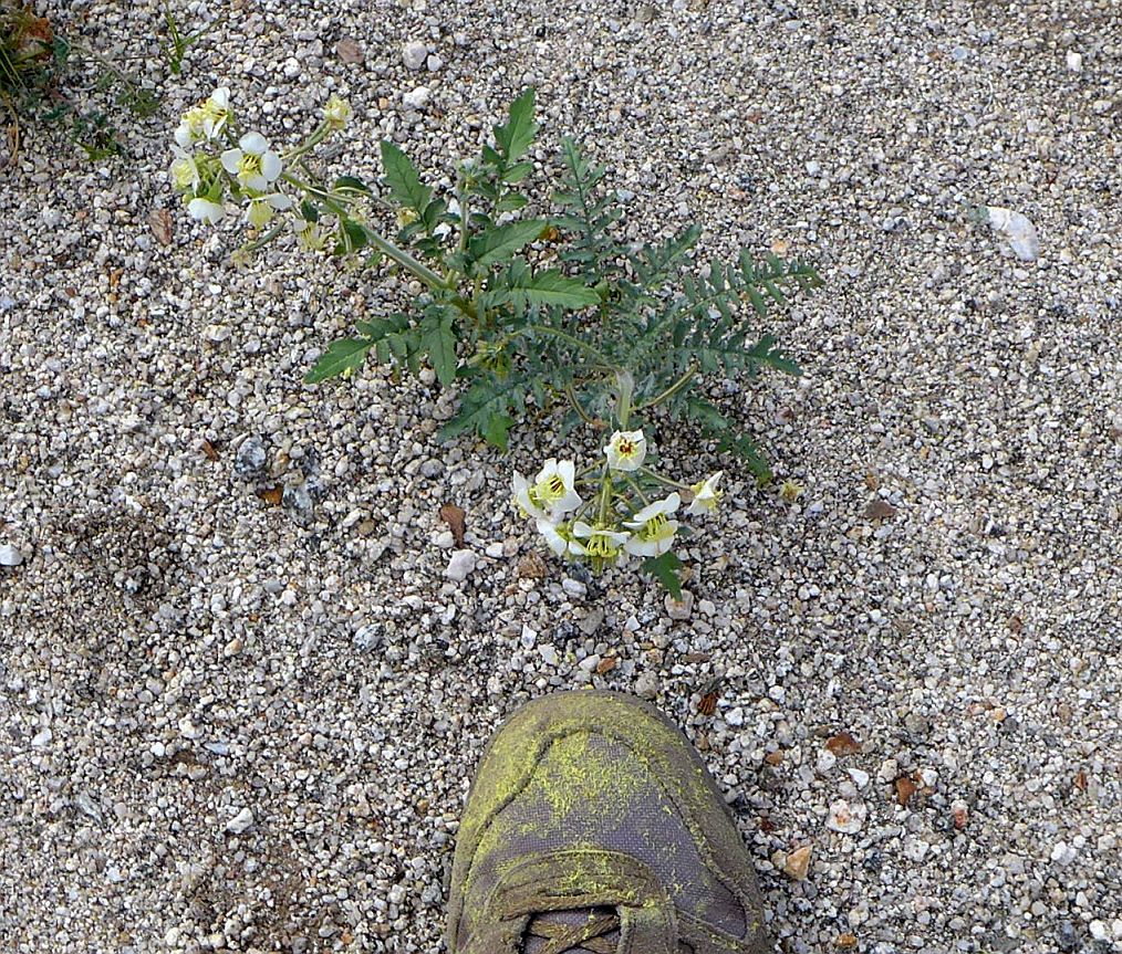 Right: Flower of brown-eyed primrose, Chylismia claviformis ssp. peirsonii, and pollen on a shoe after hiking for a short distance in the area of the Visitor Center, while trying to avoid stepping on any flowers!