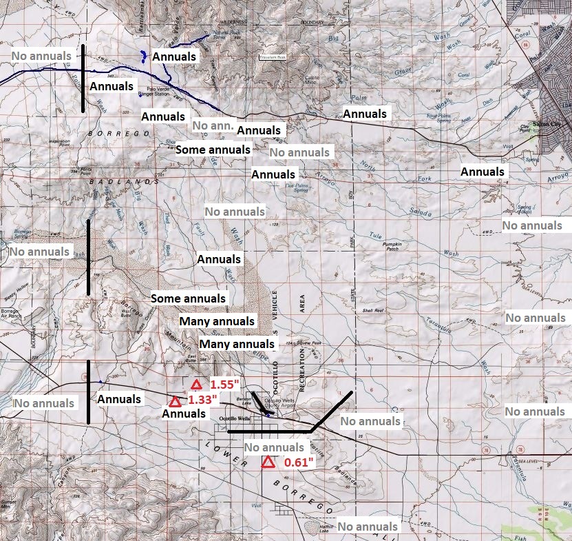 The situation in the Borrego Badlands area is more complicated, and is best shown with a map. Fig. 1 shows where baby annuals have been observed in the Borrego Badlands / Ocotillo Wells area, along with rainfall reports from stations in the Ocotillo Wells area, and areas where no germination was observed.