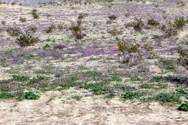 Parts of the Borrego Desert have been in full bloom since mid-January 2019; see Figs. 1 and 2 for two examples. Typically, we now observe over 2,000 plants in bloom of over 50 species on each hike (counting a maximum of 99 plants in bloom for each species). In fact, we have been observing well over 50 species of flowering plants on every hike in both November and December in those areas!
