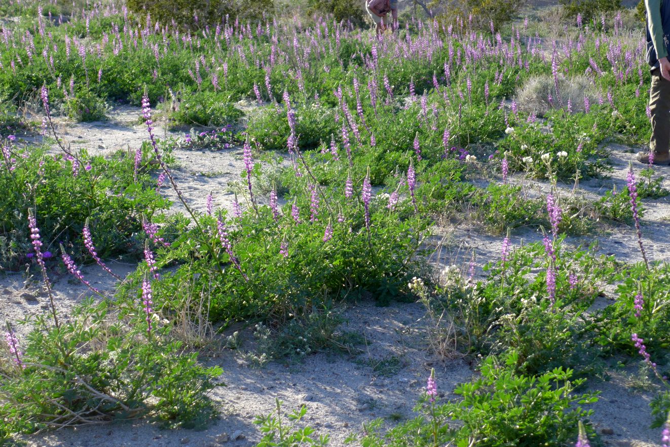 I measured one Lupinus arizonicus flowering stalk in the field shown in Fig. 1 to be 33 inches long (84 cm). The Jepson Manual gives the maximum flowering stalk as being 24 cm long, less than one third the length of many blooming stalks! The longest stalks on most plants were about 24 inches long (60 cm), still 2.5 times longer than the Jepson Manual maximum length. (Note that each stalk has about the same number of flowers open at any time; long stalks have mostly finished flowers and fruit on them. The bloom just "moves up" the stalk as it gets longer.)