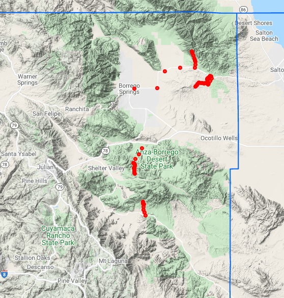 In Borrego Springs, it looks like it has not rained in ages. As you come out of the canyon (?Yaqui Pass), there is almost a sharp line between ocotillos with leaves and those that look like they have not had leaves in ages.