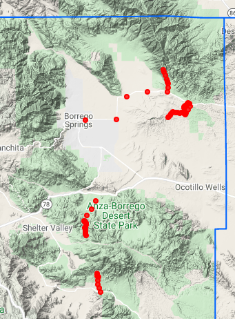 We checked for germination along S22 from Borrego Springs to the Villager Peak Trailhead on 16 January 2022, and found no germination anyplace on that route. Specifically, Don has no germination in the non-watered parts of his yard just northwest of Christmas Circle. We found no germination across from the Roadrunner Golf & Country Club; none at the corner of S22 and the Dump Road; and none just east of Fonts Point Wash. We saw no germination at all on our hike on 16 January 2022 on 2.5 miles of the Villager Peak Trail. Almost all of the plants there looked to be in their summer dormant state, with not a single ocotillo having leaves.