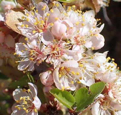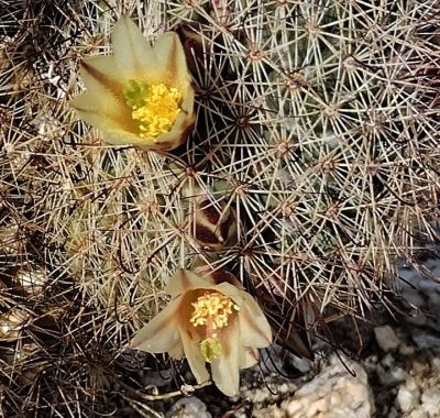 The first shrubs and cactus are now blooming in the Borrego Desert. Desert apricot, Prunus fremontii, was in full bloom along S22 from just east of the west Park Entrance at Ranchita, down to the top of the Montezuma Grade on 4 February 2022; see Fig. 1. It was also in full bloom along S2 in the San Felipe Valley on 30 January 2022. It was just beginning its bloom in Plum Canyon on 30 January 2022. The first Mammillaria dioica blooms were spotted on 29 January 2022, and have been observed in bloom in several locations, including east of Yaqui Pass Road and in Plum Canyon; see Fig. 1. Bladderpods are in good bloom in Sentenac Gorge along SR78, and in the Second Crossing of Coyote Creek / Box Canyon area.
