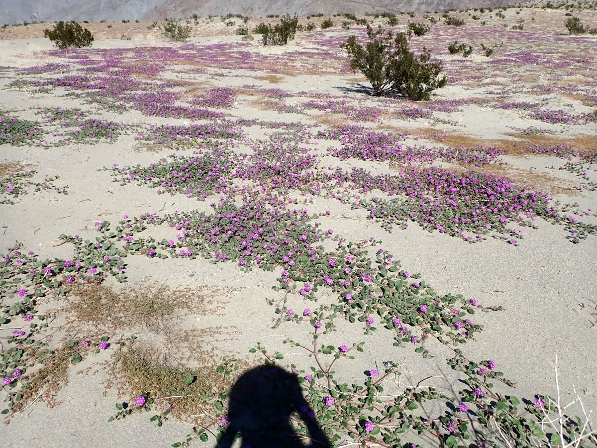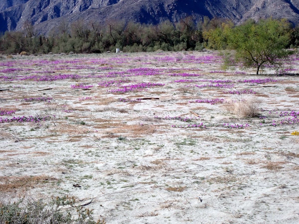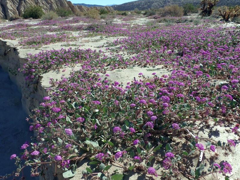 - In many sandy areas on the desert floor, from the Borrego Springs area to the Vallecito Creek / Carrizo Creek area, there are spectacular blooms from sand verbena; see Fig. 2. Those sandy areas have been in good bloom since October, and only show some signs of diminishing in March. Some of the sand verbena plants were damaged by the extreme wind event of 21 February 2023, with gusts to 67 mph recorded by NWS, and anecdotal reports of 100 mph gusts. But the vast majority of the plants are still blooming as if nothing extreme happened.