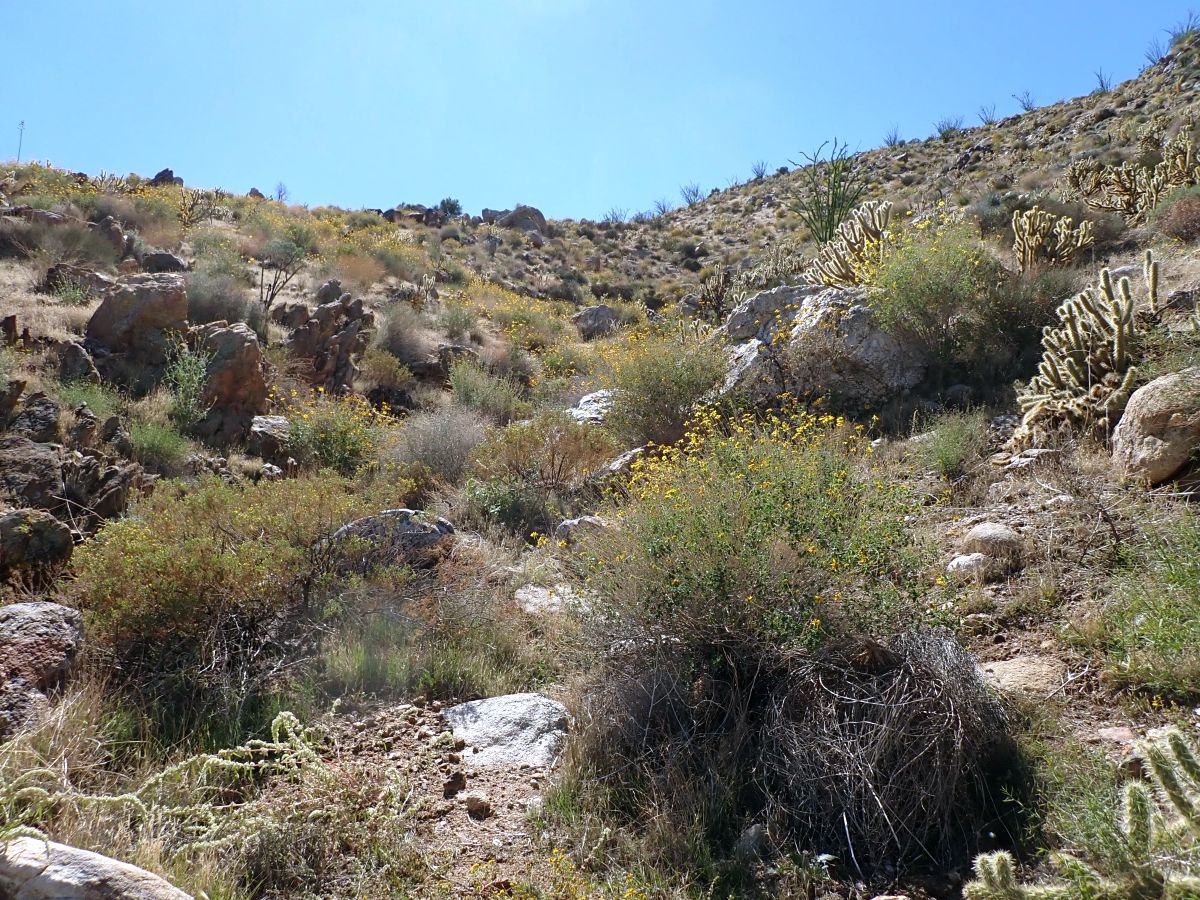 There are many locations with good blooms throughout the lower elevations of ABDSP. We have seen 50 or more species in bloom on every one of the seven hikes we've done in very different areas in February and March.