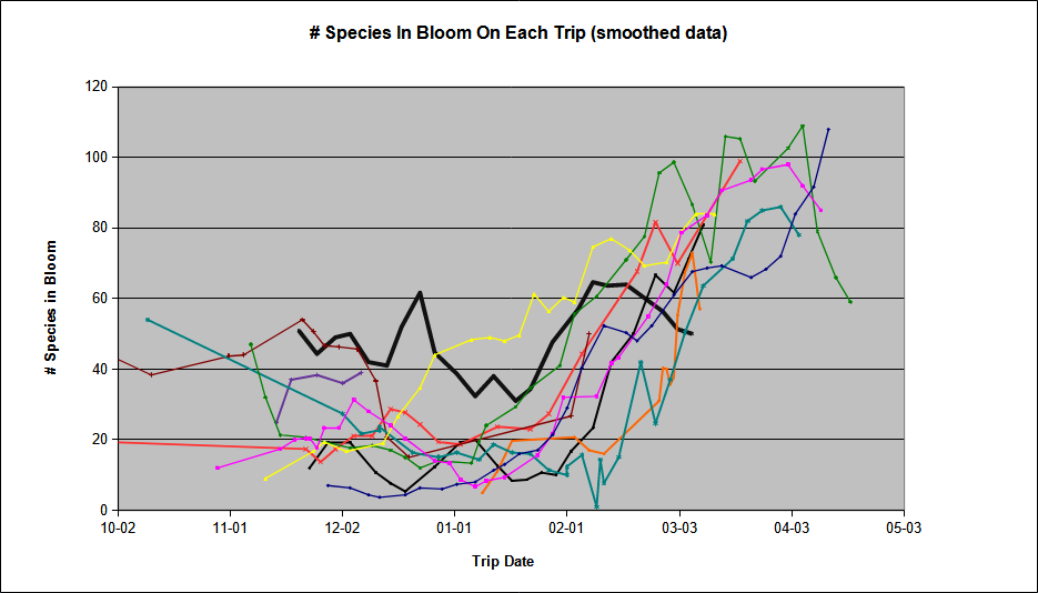 Now that the results are in, we can rate this season. On a scale of 1 to 10, with "1" a horrible year with few flowers, and "10" a superbloom year with the maximum number of flowers, we rate this season an "8". Although there are lots of flowers from a small number of species, the diversity is still very low; see Fig. 1. In a superbloom year, 100 species or more contribute the maximum "99" plants in bloom to the total count for a given day hike. This year has never had more than 30 to 40 species doing that, and in fact has never yet had more than a total of 80 species contributing even a single bloom to the count on a given hike.