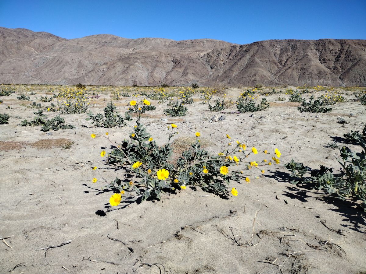 - Two huge exceptions to the above are sand verbena, Abronia villosa (see a field in the sandy area along S22 between Fonts Point Wash and the Villager Peak Trailhead), and hairy desert-sunflower, Geraea canescens (see Fig. 1). The extended good rains somehow stimulated many plants of those species to germinate in many places, and those plants should continue blooming through spring, since the sandy habitat in which these species grow is a reservoir of water that can be tapped by further growth of their roots. The big patch of desert sunflowers along Henderson Canyon Road began blooming in late November. However, it is sensitive to frost, so if Borrego Springs gets much frost, it may kill or stunt most of those plants.