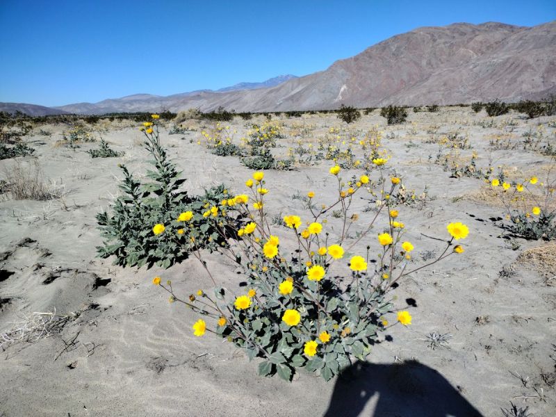 - Two huge exceptions to the above are sand verbena, Abronia villosa (see a field in the sandy area along S22 between Fonts Point Wash and the Villager Peak Trailhead), and hairy desert-sunflower, Geraea canescens (see Fig. 1). The extended good rains somehow stimulated many plants of those species to germinate in many places, and those plants should continue blooming through spring, since the sandy habitat in which these species grow is a reservoir of water that can be tapped by further growth of their roots. The big patch of desert sunflowers along Henderson Canyon Road began blooming in late November. However, it is sensitive to frost, so if Borrego Springs gets much frost, it may kill or stunt most of those plants.