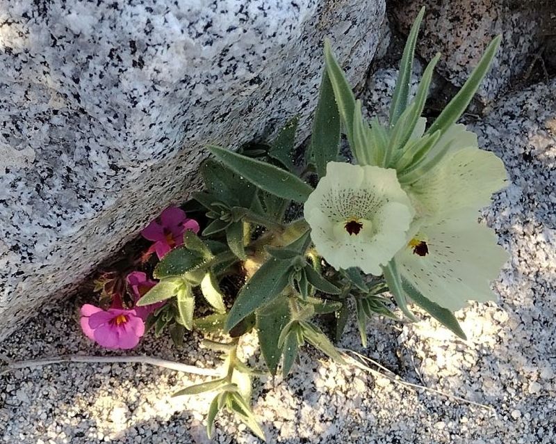 What is especially delightful is that more and more species are beginning bloom every day, such as Ghost flower, Mohavea confertiflora, and Bigelow's monkeyflower, Diplacus bigelovii (= Mimulus bigelovii); see Fig. 1.