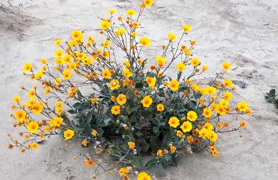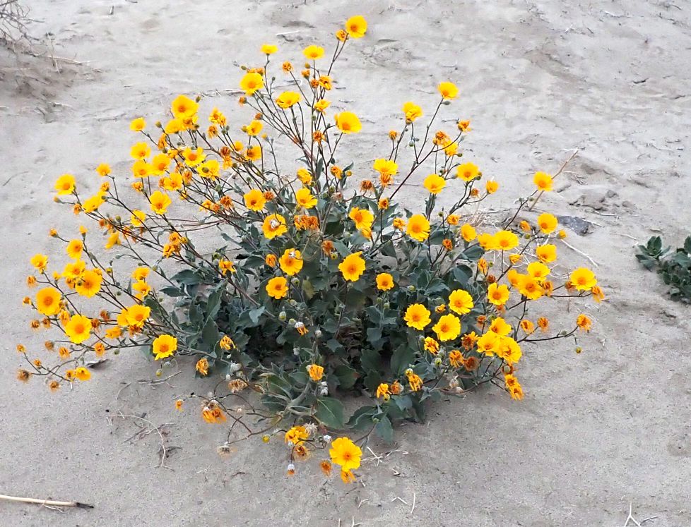 - Two huge exceptions to the above are sand verbena, Abronia villosa (see a field in the sandy area along S22 between Fonts Point Wash and the Villager Peak Trailhead), and hairy desert-sunflower, Geraea canescens (see Fig. 1). The extended good rains somehow stimulated many plants of those species to germinate in many places, and those plants should continue blooming through spring, since the sandy habitat in which these species grow is a reservoir of water that can be tapped by further growth of their roots. The big patch of desert sunflowers along Henderson Canyon Road began blooming in late November. However, it is sensitive to frost, so if Borrego Springs gets much frost, it may kill or stunt most of those plants.