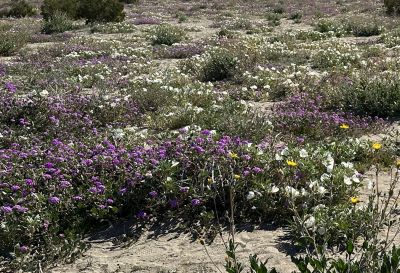 The lower elevations of the Borrego Desert, outside of the Henderson Canyon Road Flower Fields, are now entering their period of peak bloom for this season. This is about a month earlier than normal, due to an absence of rain since 1 January 2026, and temperatures warmer than normal. In mid-January, there was about a week of high temperatures around 80 deg F that were record-setting or near record-setting for that time of year. Those temperatures were typical of mid-March, and are ones that signal annuals to concentrate on producing seeds, not flowers.
