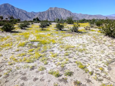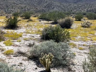 Most of the Borrego Desert is in good bloom from the monsoonal rain in August and September! There are carpets of yellow from chinchweed, Pectis papposa, in the area around the town of Borrego Springs, and almost all along S2 from Shelter Valley to beyond Canebrake; see Fig. 1. There are undoubtedly other areas with carpets of yellow, too, such as along Split Mountain Road in the Ocotillo Wells area.