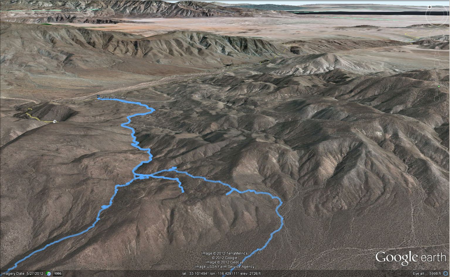 In the Google Earth View, the Plum Canyon drainage is outlined in red, with two saddles on the ridgeline dividing it from Earthquake / Shelter Valley shown in red diamonds. Blue lines show our survey routes on 12 and 21 December 2012. The northernmost route corresponds to the old Wagon Road built by John McCain sometime after 1895 and prior to 1913, which was only superceded in 1922 when SR78 was finished through Sentenac Gorge. Many traces of the old Wagon Road are still visible along most of its route on the Sentenac Cienega side of the Plum Canyon Saddle, but only a few traces are visible on the hike from the Plum Canyon Parking Area to the northernmost saddle.