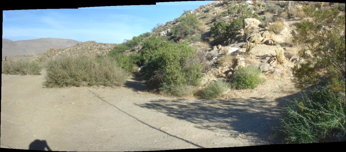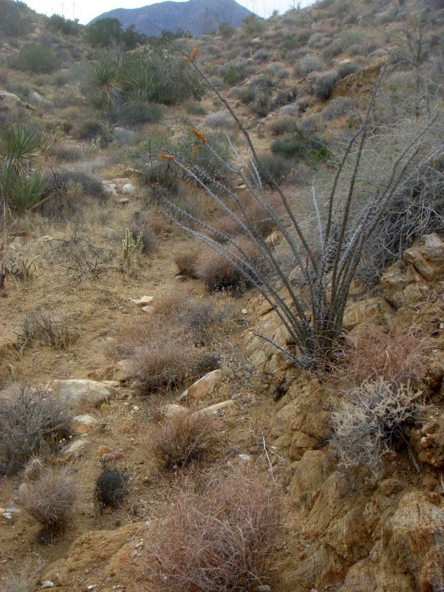 An even more interesting botanical trip is to start walking at SR78, to experience the full transition from the lower-elevation desert proper to the lower part of the desert transition zone near the top of the canyon. That walk is roughly 6 miles roundtrip with 900 feet of elevation gain, from 1700 feet to 2600 feet.