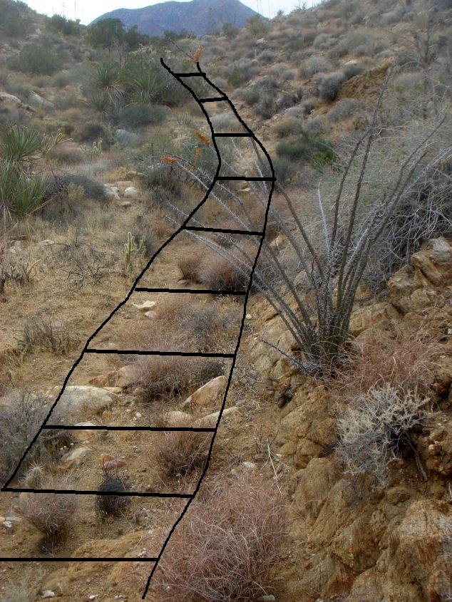 Lower Plum Canyon was called Wagon Wash in those days, and was part of the wagon route from Earthquake / Shelter Valley to Yaqui Well. The old route heading west branched at the top of Plum Canyon; the California Riding and Hiking Trail follows one of the branches south from Upper Plum Canyon to North Pinyon Mountain Road in Earthquake / Shelter Valley. The other branch headed west down to the Sentenac Cienega area. (see map of Wagon Wash; Wray 2004 The Historic Backcountry: A geographic Guide to the Historic Places of the San Diego County Mountains and the Colorado Desert; and the 1913 topo map with the vegetation mapping showing the routes.