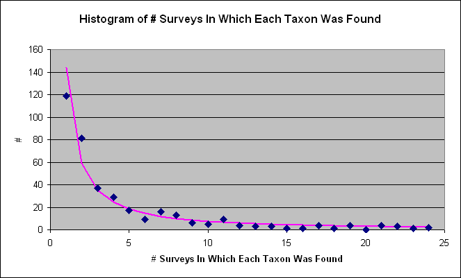 Note that such widespread common species are rare; see the histogram below that demonstrates the well-known biological law that common species are few in number; rare species are common in number.