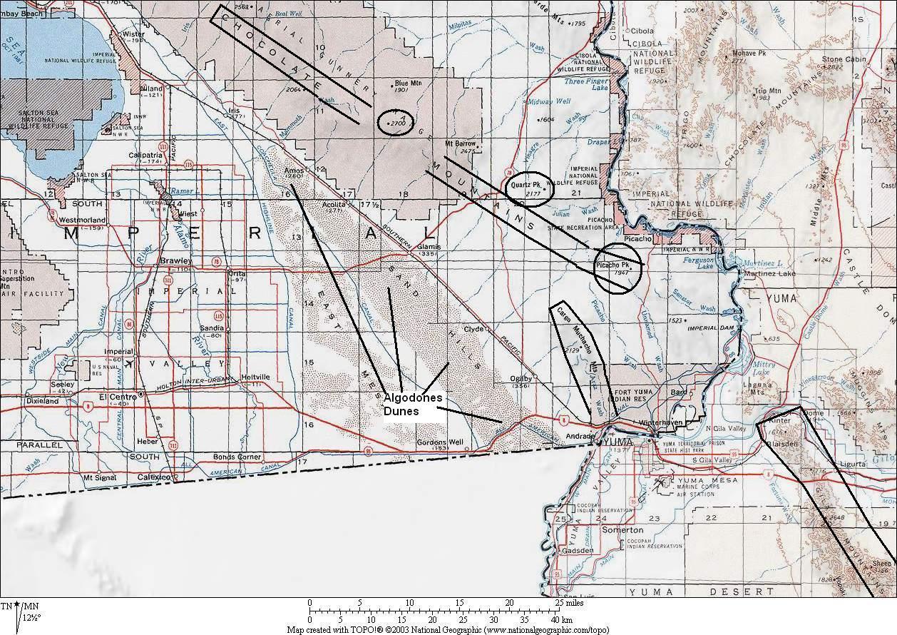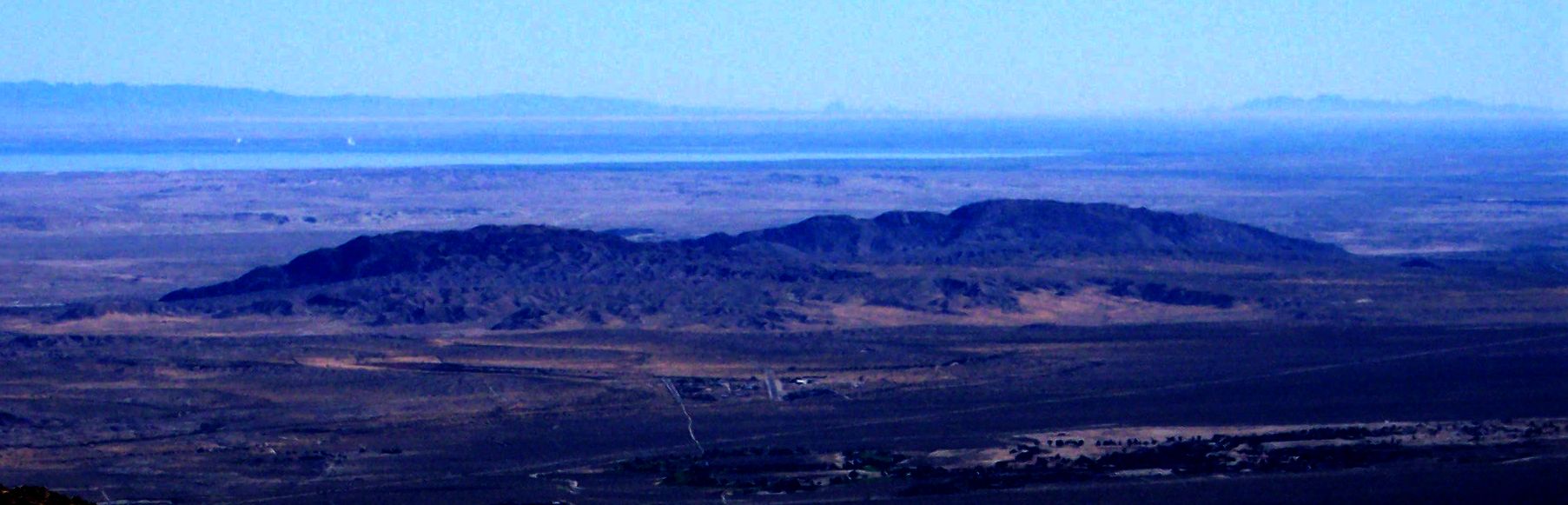 The farthest peak seen in the photograph above is Picacho Peak, in the southern end of the Chocolate Mountains, 106 miles away, and just three miles from the Colorado River. Quartz Peak is just six miles from the Colorado River.