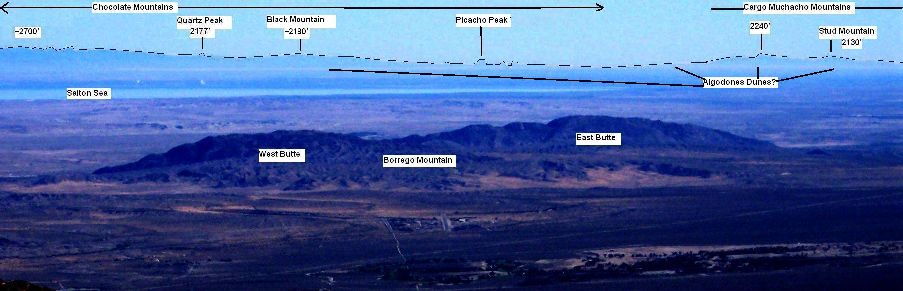 Feature Distance (miles) Azimuth (degrees east of north) Travelers Peak (peak at east end of Santa Rosa Mountains) 21 72 Fonts Point 14 77 Borrego Sink 9 88 Peak ~2700 feet, Chocolate Mountains 78 91 Quartz Peak, Chocolate Mountains 96 95 Black Mountain, Chocolate Mountains 96 96 Borrego Mountain, West Butte 15 96 Picacho Peak, Chocolate Mountains 106 99 South tip of Salton Sea 44 99 Borrego Mountain, East Butte 18 100 Peak 2240, Cargo Muchacho Mountains 99 102 Stud Mountain, Cargo Muchacho Mountains 102 103 I used those azimuths combined with angular distances measured in my photographs to label the locations in the photograph above.