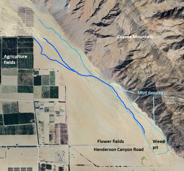 Coyote Creek Drainages near Henderson Canyon Road Flower Fields Fig. 1. The main drainage channels of Coyote Creek on the southwest side of Coyote Mountain near the Henderson Canyon Road Flower Fields. The main channels in 2025 are traced with heavy blue lines, with a secondary channel in the northern half of the pix traced with a lighter blue line. There are many braided channels in the area in the southern part of the map outlined in very light blue, marked as "Mud deposits", with only the main channel in December 2025 traced with the heavy blue line. Near the road, at the south end of the mud deposits, is a "weed pit" composed mostly of non-native plants.