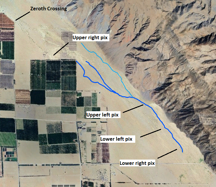 Fig. 3. Zoomed Google Earth view of two of the Coyote Creek drainages shown in the upper left portion of Fig. 1 just east of the label "Agriculture fields". See also view without the blue lines.