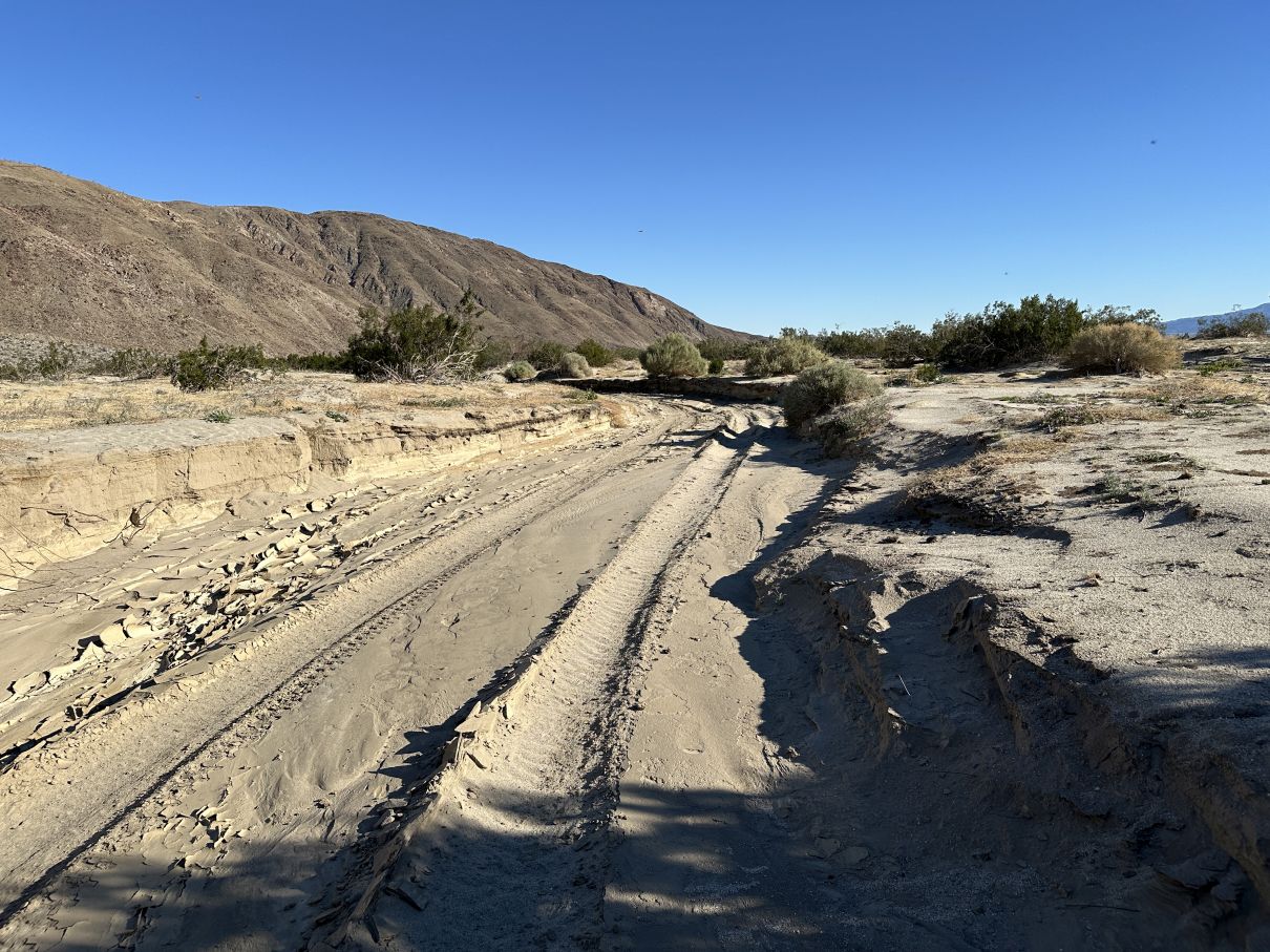 The southern drainage seen in Fig. 3 is especially easy to trace, since it is typically 10 to 20 feet wide, and is incised over nearly its entire length by two to three feet. When we traversed it in December 2025, it had ~10 foot wide dried mud in the channel over most of its length, and had unfortunately been driven on by an unauthorized vehicle; see one example.
