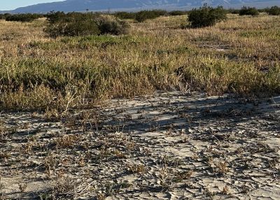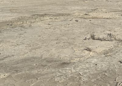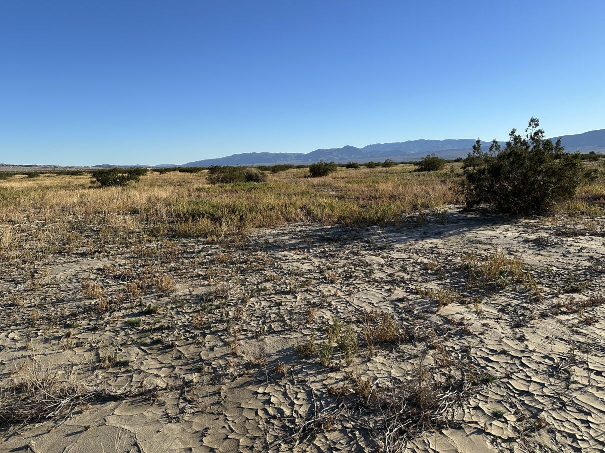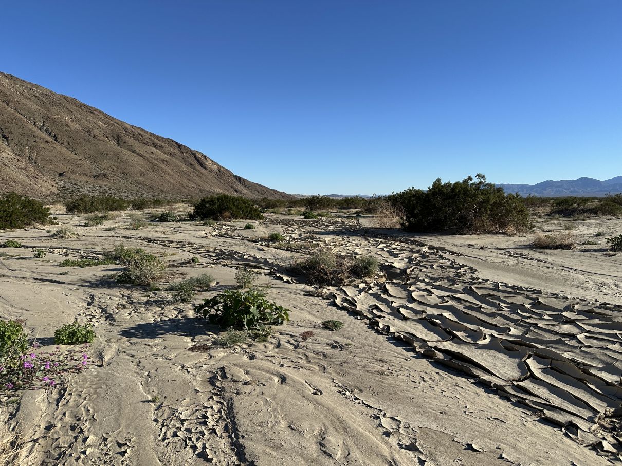 Top left: Photograph taken on 8 December 2025 of an area where water was spreading out and sinking into the ground on 23 November 2025. On 23 November 2025 we were stymied in continuing east by the large areas of mud here, and had to retreat west where we could cross an area where most of the water was still in a channel.Top right: Photograph taken on 5 December 2025 of an area below Zeroth Crossing (where Coyote Creek crosses Coyote Canyon Road 0.6 miles north of the end of the pavement of Di Giorgio Road) where the sand / mud spread across a large area, just north of orchards.