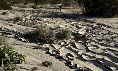 - In areas where the slow-moving water finally soaks into the ground in moderate amounts, extensive layers of mud are deposited, with very little native plant growth in the mud. Those mud layers also curl up when they dry.