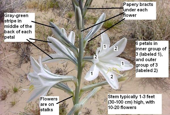 Distinguishing Characteristics and Similar Species Fig. 1. The picture above (without the labels) is a crop of a beautiful bigger picture by Michael Charters, taken in the eastern part of the Mojave National Preserve (see his full page on desert lily with more information)