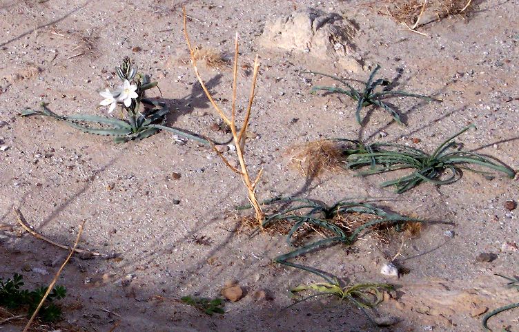 Fig. 8. Picture taken by James Dillane on a hill of conglomerate in the upper portion of the South Fork of Palm Wash, on 2 January 2009. The six plants on the right look very different from the young plants growing in sand since they have just emerged from the rocky soil and still retain their subterranean shape. The two plants on the left have developed into normal-looking desert lilies, since they emerged from the rocky soil earlier. Note that they each consist of three equal-length leaves, which must have been tightly bunched earlier as in the plants at right. Desert lily is a monocot, which typically have parts in threes.