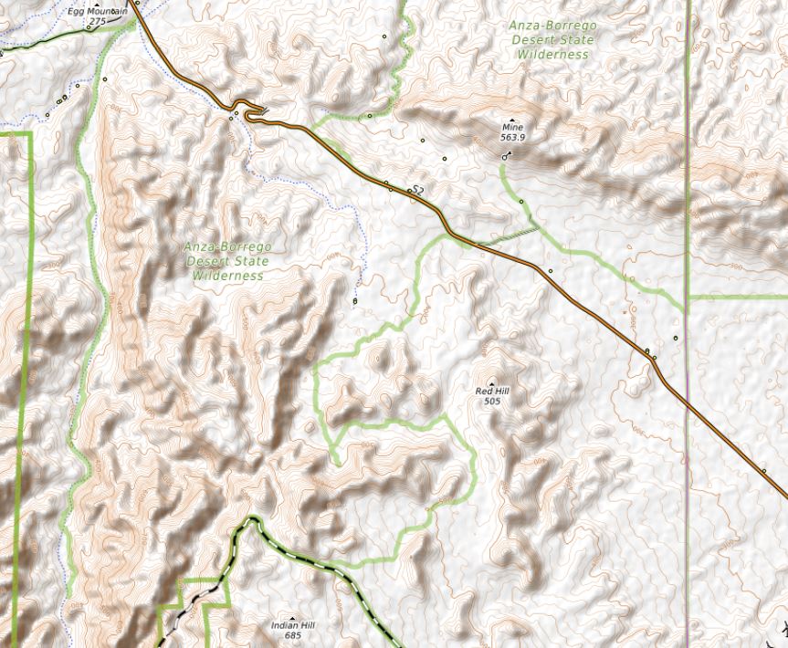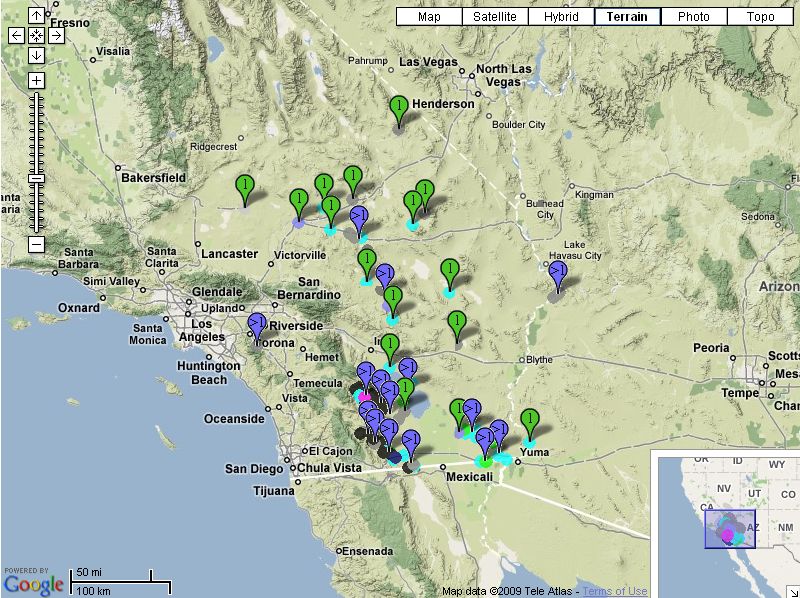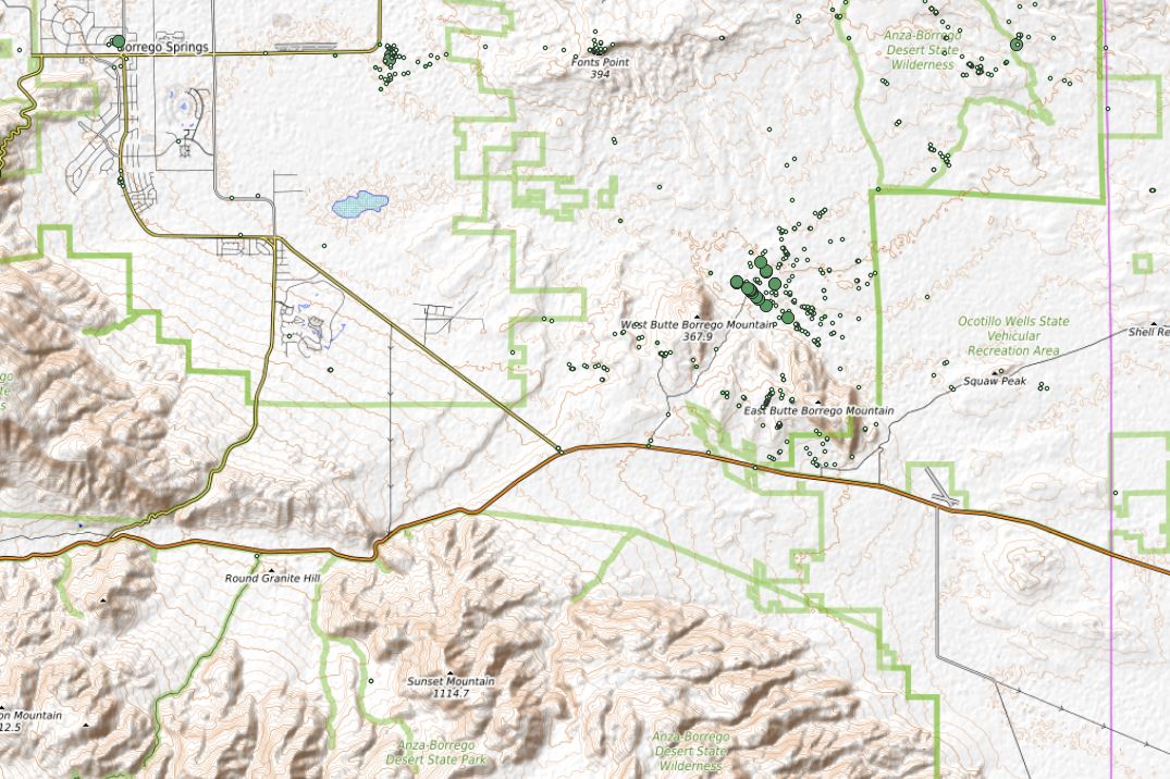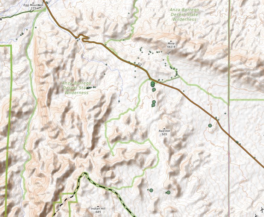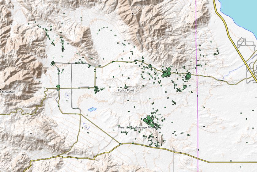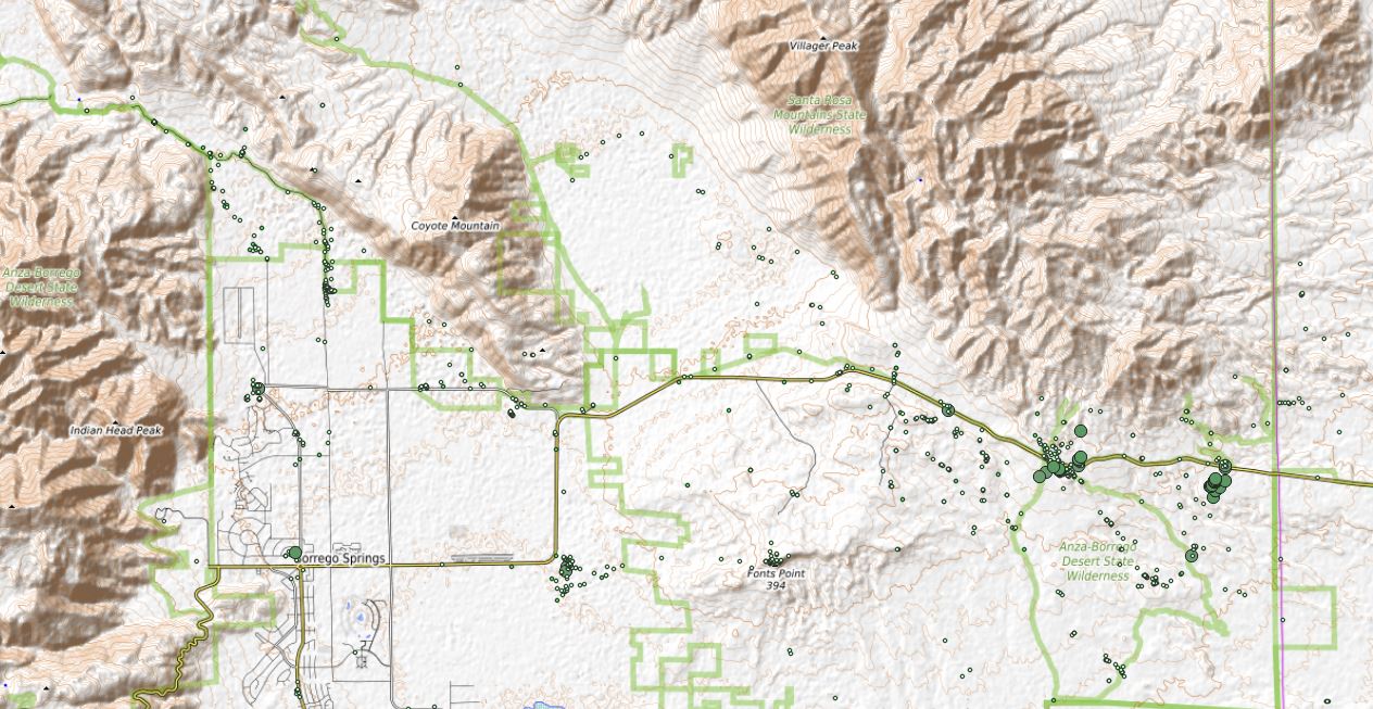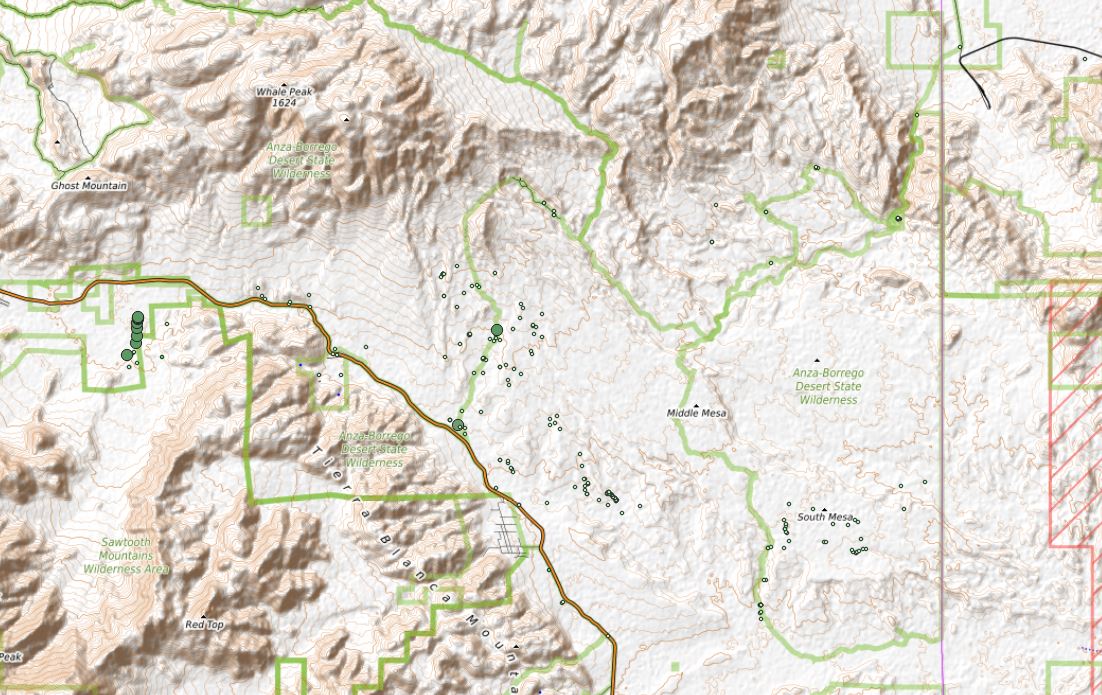 Note that most iNat observations do not have associated abundances, and half of my data has not yet been digitized, so there are almost surely more locations with at least 50 desert lilies. But we do encounter many locations that have just one or a few desert lilies, or scattered numbers that do not add up to 50 plants, such as in the Horse Camp Area in the northeast Borrego Valley area.