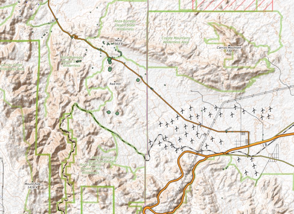 In Fig. 18, some of those larger symbols are from the same population, and hence overlapping large symbols do not necessarily mean more than 50 desert lilies in an area. An example is the area southwest of Vallecito County Park, where nine iNat observations from the population were each tagged with being part of the same large population. That can happen in my surveys, too, when an area was surveyed with differing starting points.