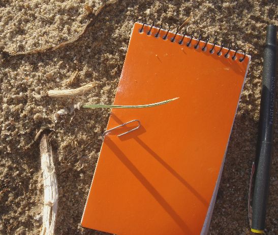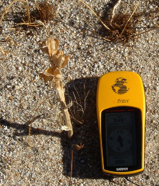 Fig. 3. A single desert lily leaf emerging from sand. Picture taken on a broad flat saddle south of Seventeen Palms in the Borrego Badlands on 19 December 2008.
