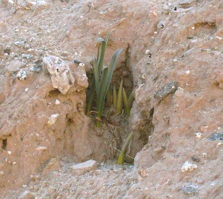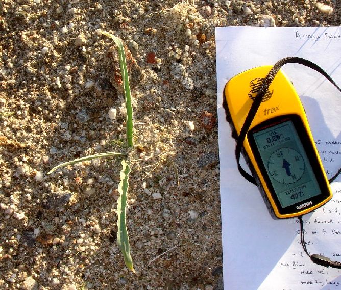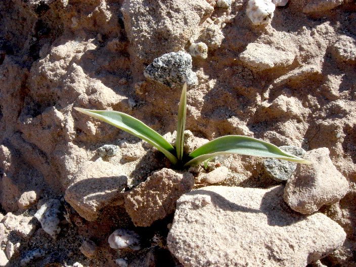 Fig. 5. A young desert lily plant with three leaves emerging from a hard soil made of broken-up rock and cemented sand grains. Picture taken on a hill of conglomerate on the use trail to get around the waterfall in the upper portion of the South Fork of Palm Wash, on 19 January 2009.