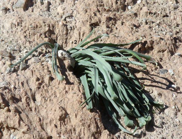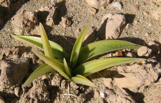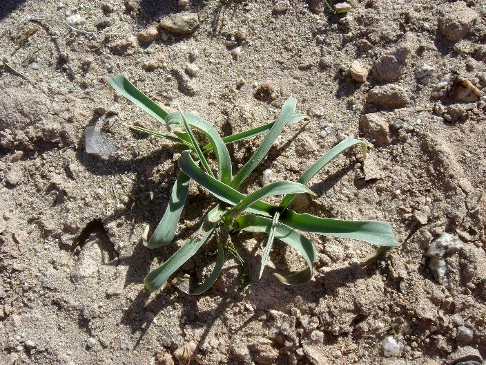 The following pictures show young plants emerging from broken-up rock. The leaves have to be more substantial to push through rocks, and hence are thicker, and more clumped as they push up, giving a quite different appearance. Two of the emerging plants shown below were photographed by James Dillane on 2 January 2009, and both he and I could not believe these could be desert lily. As a result, we made a special trip on 19 January 2009 to relocate these plants, and were dumbfounded that they became normal-looking desert lily plants. We also were able to find, in a nearby area, some additional plants that had just emerged, which resembled the plants of 2 January 2009. One picture of those plants is shown below.