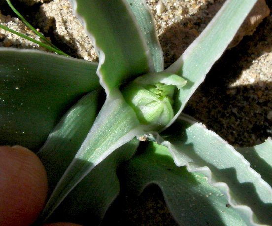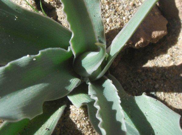 Picture taken on a flat area along the upper Calcite Mine Road on 21 February 2008.Mature leaves are usually wavy, but can sometimes have straight edges. The following pictures were taken in Palm Wash, near the Calcite Mine Road, on 19 January 2009, of two nearby plants.