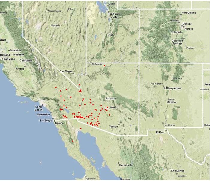 Desert lily is widespread in both the Mojave and Sonoran Deserts. The following map shows the distribution of vouchers with coordinates from the Consortium of California Herbaria made in 2009 (only California locations are plotted):