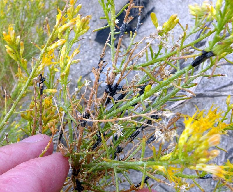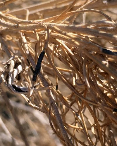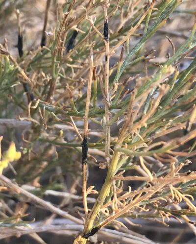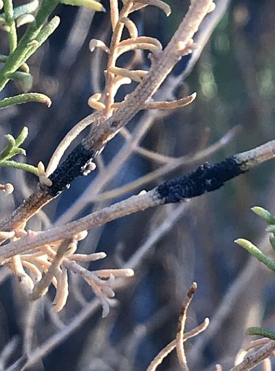 The famous "black band" is a very-curious characteristic of this species. Well over 90% of all plants have one or more short black sections on their twigs, which are caused by a fungal infection, said to be a smut fungus. The black bands are most apparent on dead stems, but are found on live stems, too. We don't know whether the fungus kills those stems, or whether the stems die naturally and the fungus takes over as they die.