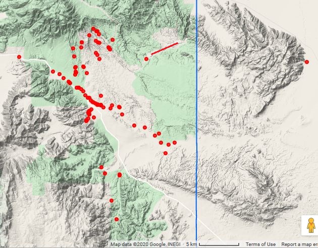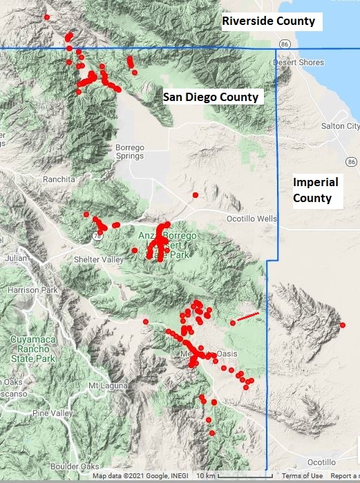 - 177 GPS points from surveys by Tom Chester and companions, including 94 points from a dedicated survey for it in Nolina / Pinyon Wash on 26 December 2020; 42 points from a dedicated survey for it along Indian Creek wash in the southern portion of Collins Valley on 23 November 2016, and 14 points from the San Felipe Creek / Yaqui Flat area from surveys on 25 and 30 November 2020. In all of those surveys, plants were GPS'd every 30 feet or so.