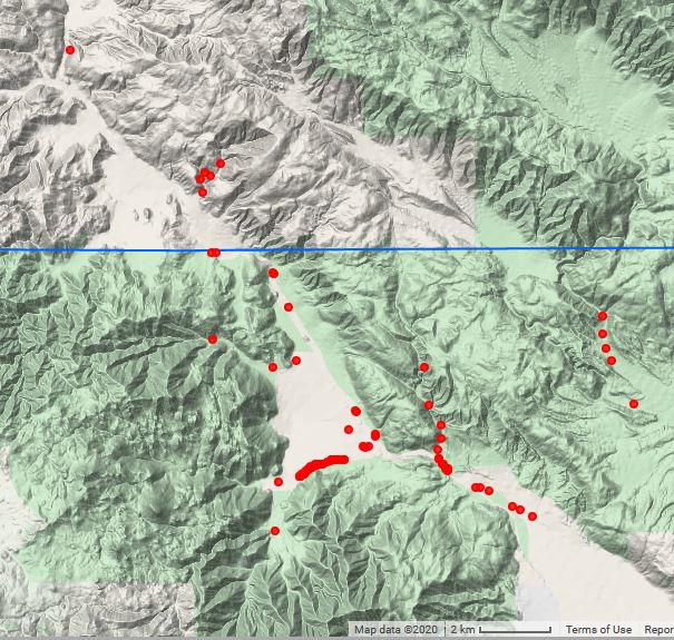 - Vallecito Creek / Drainages south of Whale Peak / Canebrake Creek / Carrizo Creek. There are 123 GPS points in this area, which are fairly dense in Carrizo Creek. Assuming 15 to 50 plants per GPS points gives 2000 to 6000 plants.