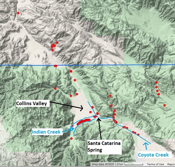 Fig. 4. The geographic distribution of E. paniculata in the Collins Valley area. Coyote Creek extends from the top left of the map to the bottom right; only a small portion of it is shown by a blue line. Indian Creek has a number of washes associated with it, roughly within the parallel blue lines.