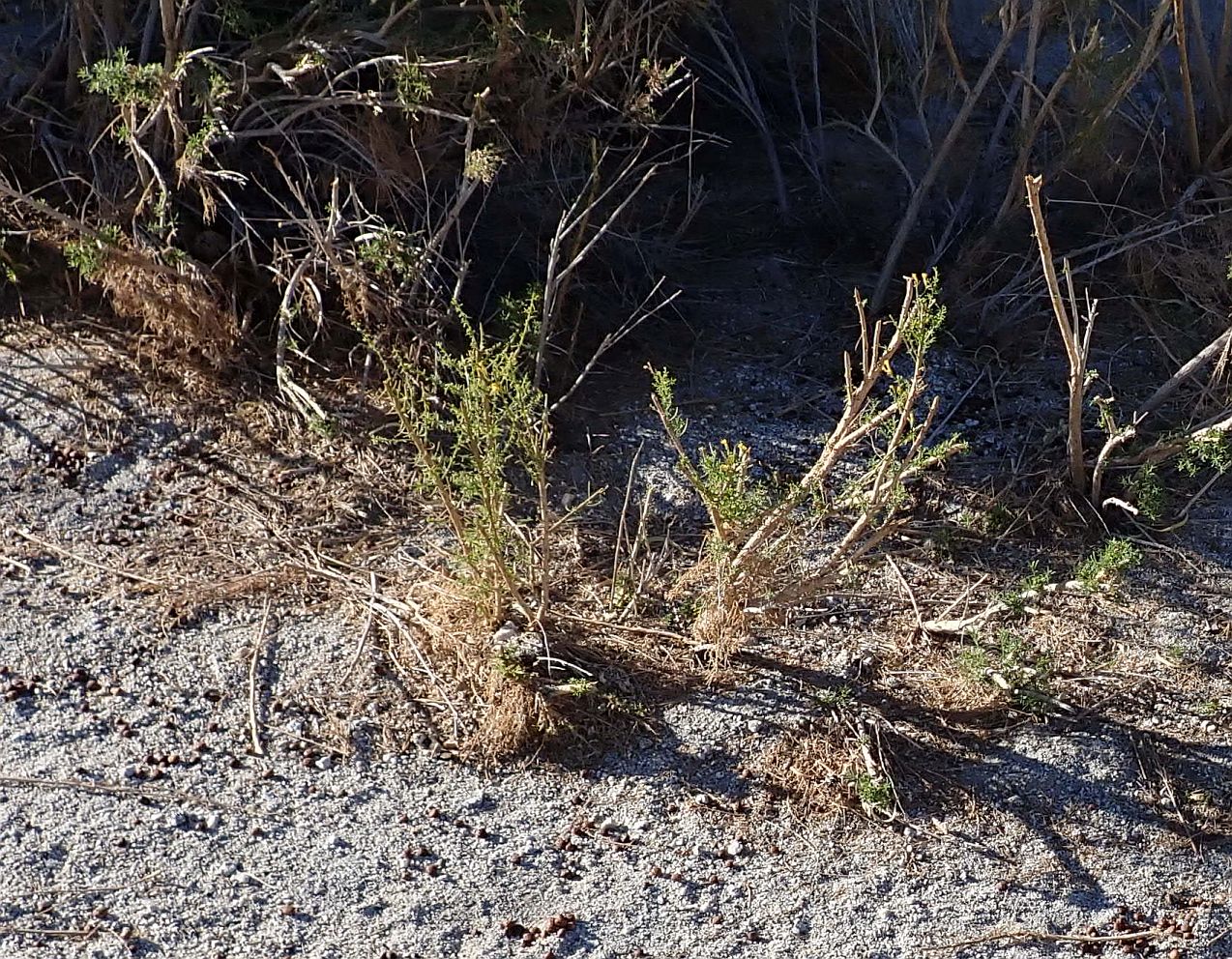 There is one place that we know of where this species is not growing in well-watered deep sand. Five plants grow along the lower side of SR78, perhaps 20 to 30 feet above San Felipe Creek as it emerges from Sentenac Canyon. Apparently the road fill and possible alluvium deposits store enough water to allow not only this species, but at least one mesquite plant, to grow there. This area gets not only rain runoff from the road, but runoff from the cliffs above the road. See two plants, including a discussion and pano shots of the area, here and here.