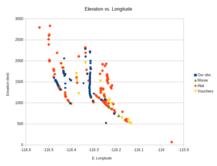 The elevation distribution of E. paniculata is shown in Fig. 7, where it is plotted versus longitude. In our area, E. paniculata lives mostly at elevations of 500 to ~1800 feet, with a small number of plants found up to 2800 feet, and what is probably a waif at near sea level. A similar now-dead waif is found at 500 feet in San Felipe Creek at Borrego Mountain.