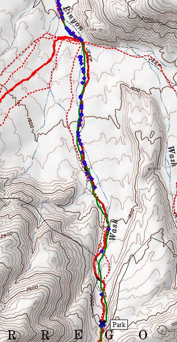 - Nolina / Bighorn / Pinyon Washes / Narrows. We counted all the plants in Nolina / Pinyon Wash from SR78 to the parking area at the entrance to Pinyon Canyon, and took a GPS point every 50 to 100 feet. We counted a total of 1,187 plants, taking 93 GPS points, an average of 13 plants per GPS point. The number of plants here is therefore a minimum of 1200 plants up to perhaps 2000 plants to account for areas without a detailed survey in Bighorn and Pinyon Wash above its junction with Nolina Wash.