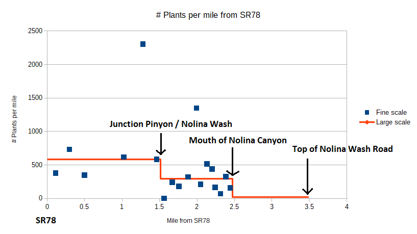 The number of plants is markedly lower above the junction of Pinyon and Nolina Wash, where the wash only has water coming from Nolina Wash. The number of plants is extremely low, but not zero, above the mouth of Nolina Canyon. Above that point, the plants were only found in widely-spaced small clusters. As a result, no points for the number of plants per mile are plotted there; only the average for that length is given.