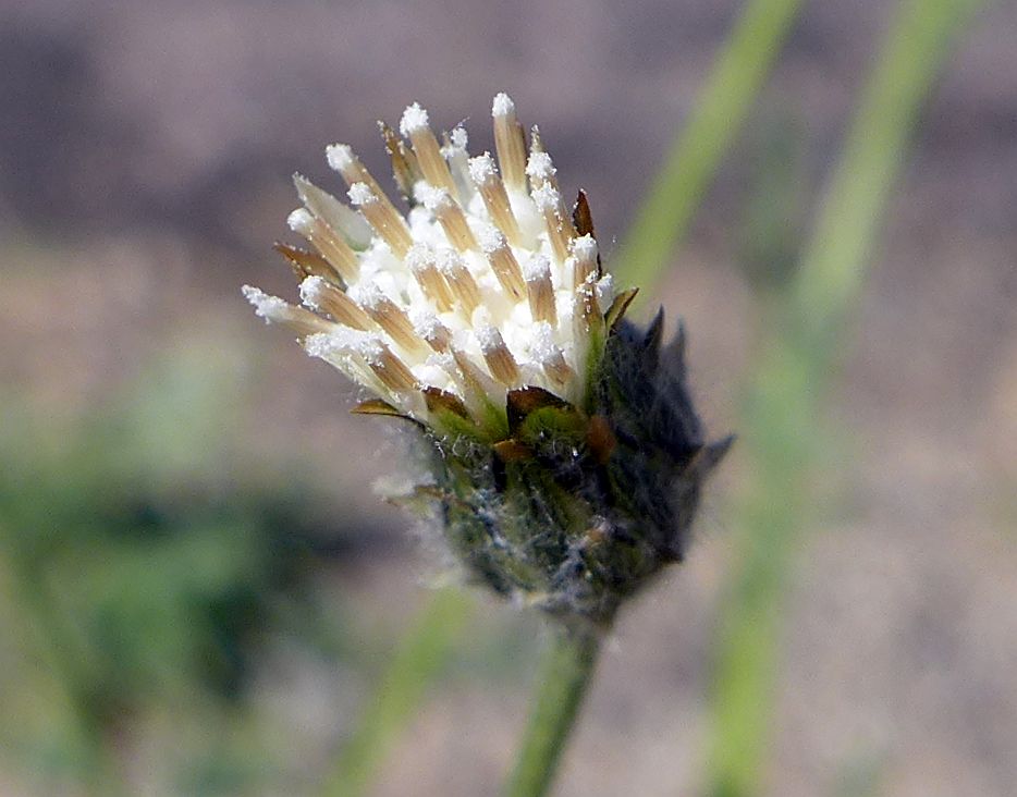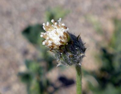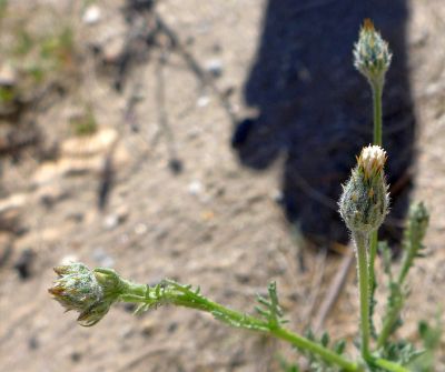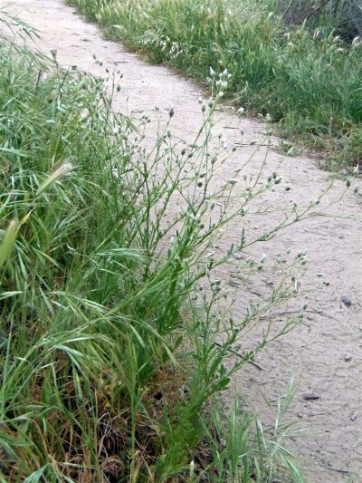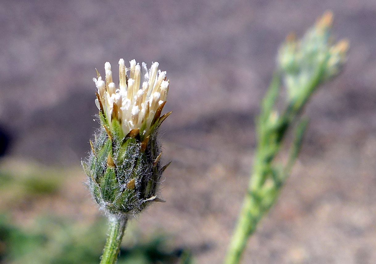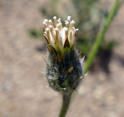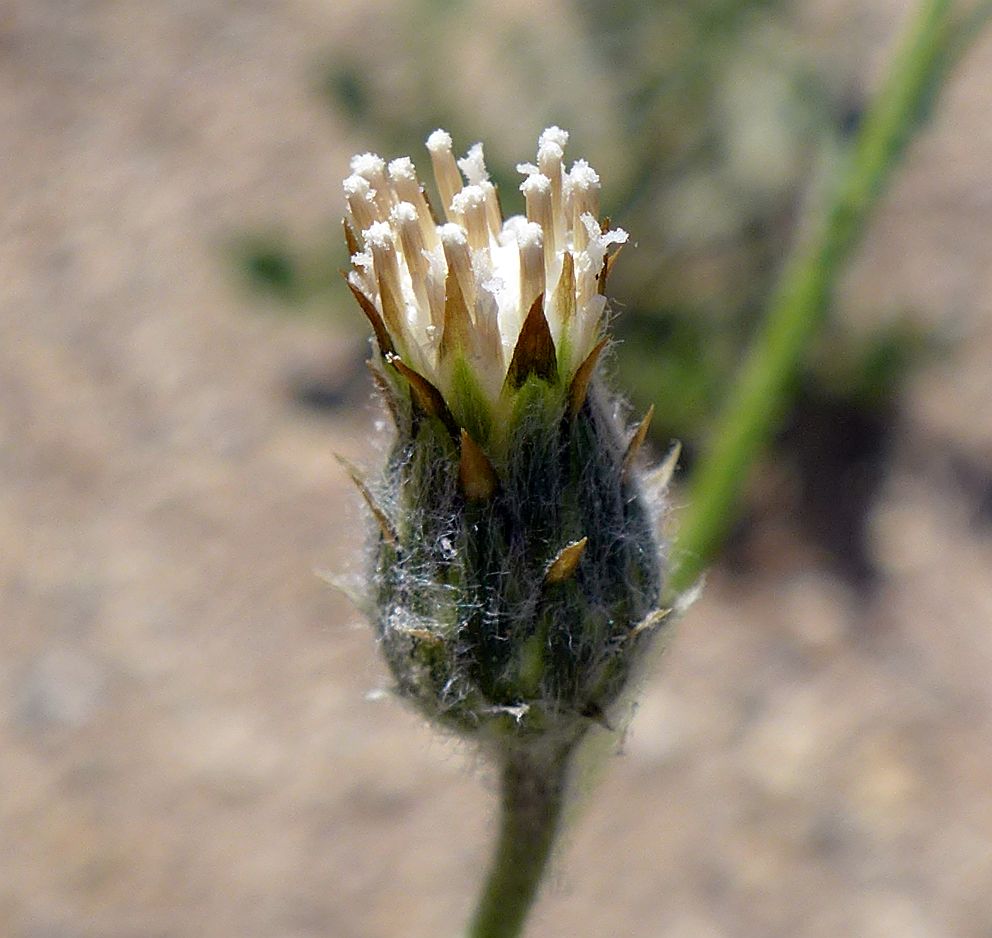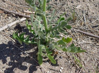 2011 March 18. Ruth Ehly, a San Diego County Plant Atlas parabotanist, visited her adopted square F24 with Larry Hendrickson and Whitney Meier. At the Borrego Valley electrical substation, they noticed a few plants of a species they didn't recognize which were not yet flowering. The plants had the look of a Centaurea species to them, too, but again didn't fit any of the descriptions for it or the closely-related Volutaria muricata that was in the Jepson Manual. Nonetheless, Whitney searched for images of Volutaria plants, and found the single online image of V. canariensis, which appeared to be a match. (Note that it was later discovered that our plants were actually V. tubuliflora).