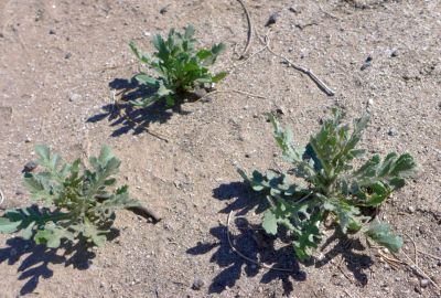 The observation on 23 February 2010 was on the Alcoholic Pass Trail on a hillside, and probably germinated from the one inch of rainfall received by Borrego Springs on 7 December 2009, or the five inches of rainfall received during 18-22 January 2010. Similar good fall / winter rainfall germinated the plants seen in 2011, and many of those plants probably went to seed unnoticed. Since each plant can produce roughly 2500 seeds, we suspected in spring 2014 that there may be a large seed bank in Borrego Springs already, awaiting enough rain to germinate. This fear unfortunately turned out to be correct in 2015.