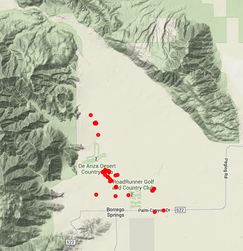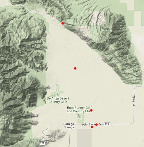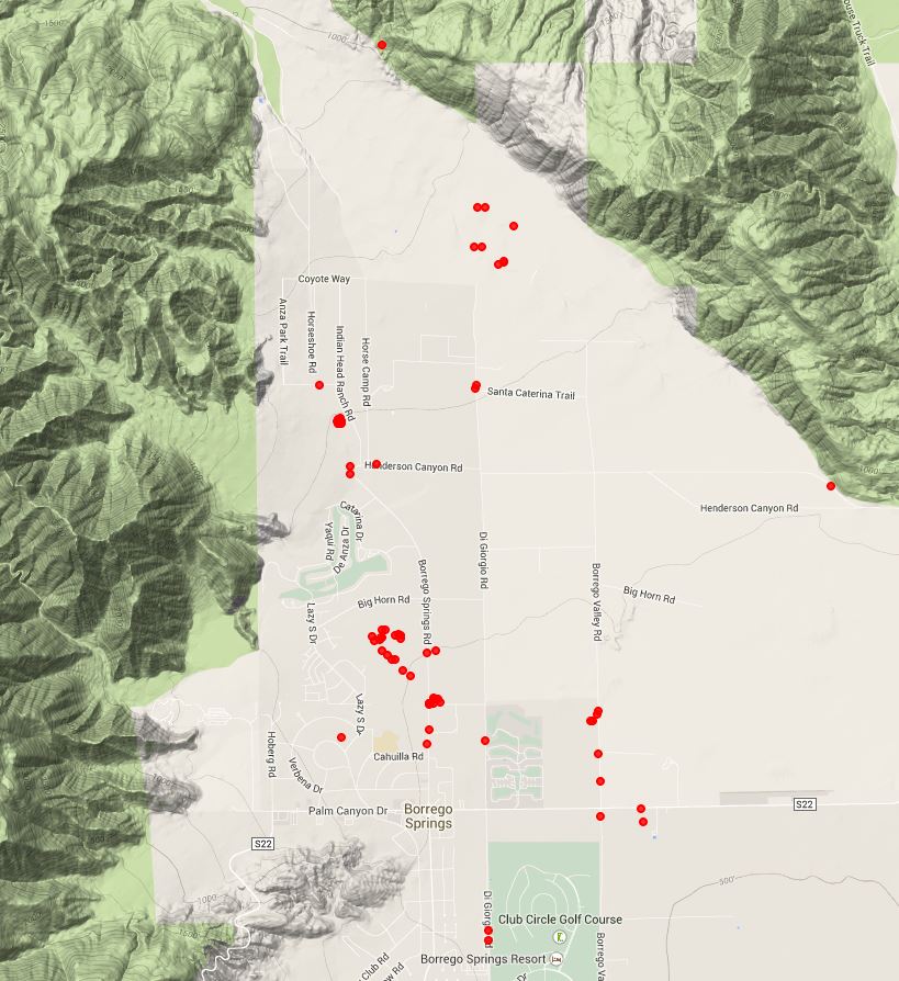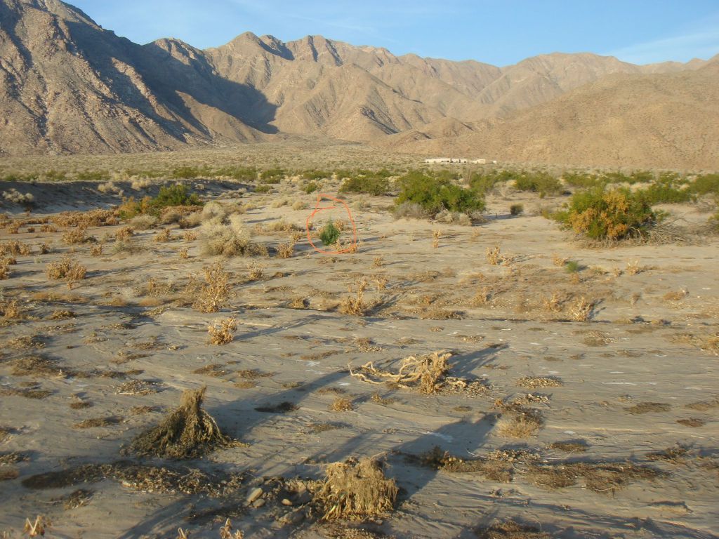 Site # # Plants Location 1 4 0.5 mile north of Christmas Circle, west side of road 2 598 1 mile north of Christmas Circle, east and west side of road 3 3 Borrego Springs Rd. 0.5 mile north of site 2, at a Borrego Water District pump 4 30 Wash through Indian Head Ranch, from 0.5 miles south of southern dam, to below intersection of Henderson Canyon Rd. and Borrego Springs Rd. intersection 5 3 Di Giorgio Rd and Palm Canyon Rd 6 10 West side of Di Giorgio Dr. opposite the Springs entrance 7 365 Borrego/Roadrunner property, 500 acres 8 1 SDG&E substation 9 57 A large green rectangle in Google Earth View, bounded by Borrego Springs Rd on the East; Lazy S/ Diegueno Dr, edge of residences on the West; Big Horn Dr. on the North; and an unnamed sand rd. on the South. 10 57 Wash through Indian Head Ranch, at Stagecoach Way road edge 11 88 Wash through Indian Head Ranch, 0.25 miles south of Stagecoach Way 12 2 East on Palm Canyon 13 89 DiGiorgio Rd.west road edge, 0.8 mile north of Henderson Canyon Rd.